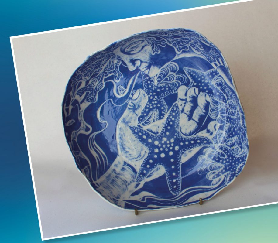 This artwork is a porcelain bowl (250 x 50mm) with sgraffito – a technique of cutting away parts of a surface layer to expose a different colour underneath. Created by Ilse Black 2022.