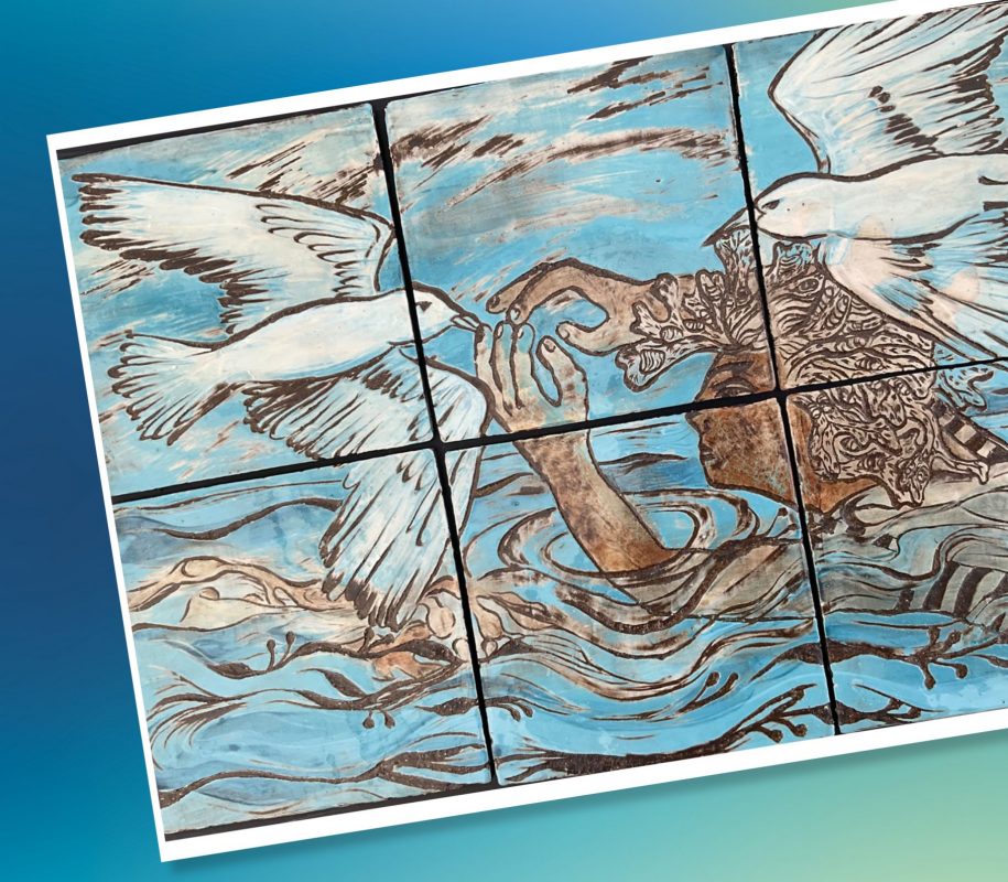 This artwork is stoneware tiles with sgraffito (450 x 300mm). Created by Ilse Black 2022.