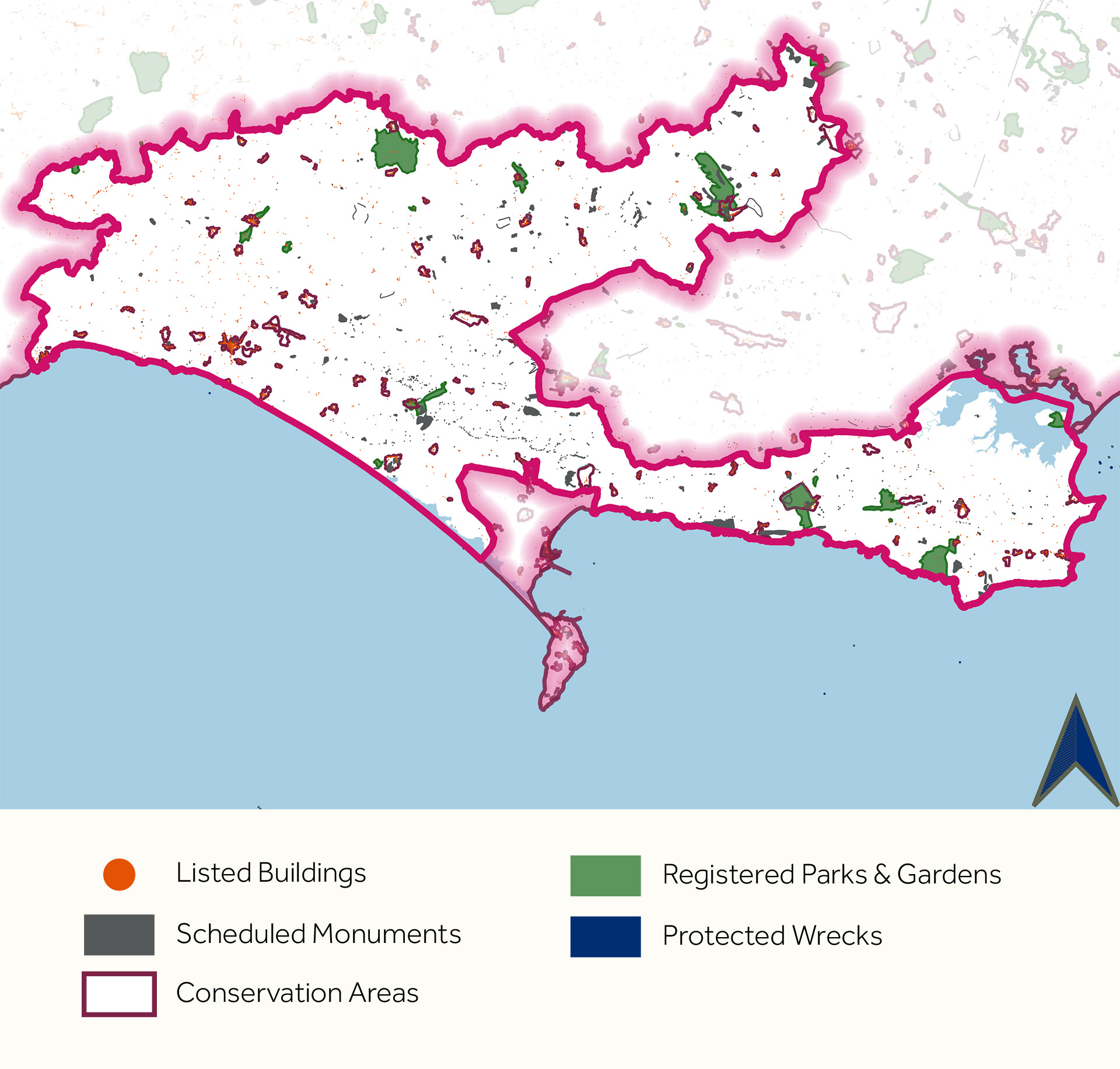The Dorset National Landscape has 542 Scheduled Monuments totalling over 1,150 ha. Also within the National Landscape are 19 registered parks and gardens covering over 2,500 ha (1 Grade I, 9 Grade II*, 9 Grade II), 17 locally important parks and gardens, 89 conservation areas, and 4,009 listed buildings (114 Grade I, 223 Grade II*, 3,672 Grade II).