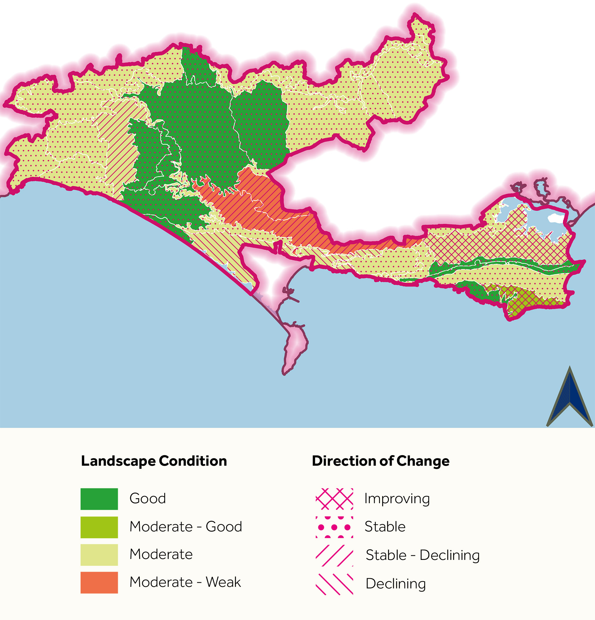 Each landscape character area has been assessed in 2018 for its condition and the direction of travel. This assessment helps to prioritise action geographically. More detail can be found in the Dorset National Landscape LCA.